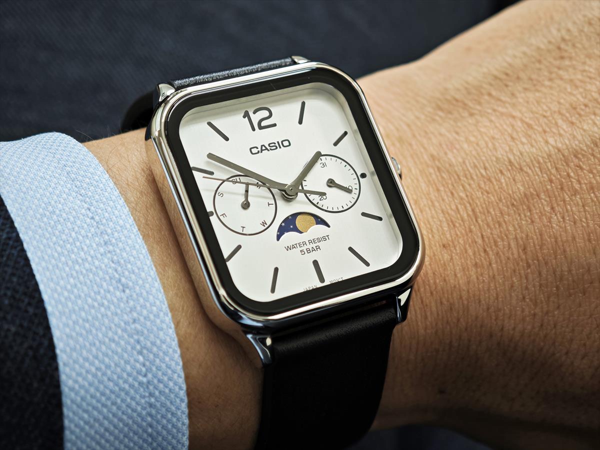 | ムーンフェイズと日付・曜日を備えたMTP-M305L-7AJF。 クリアなホワイト文字板にブラックレザーを合わせ、ビジネスにも映える一本。5気圧防水。 |