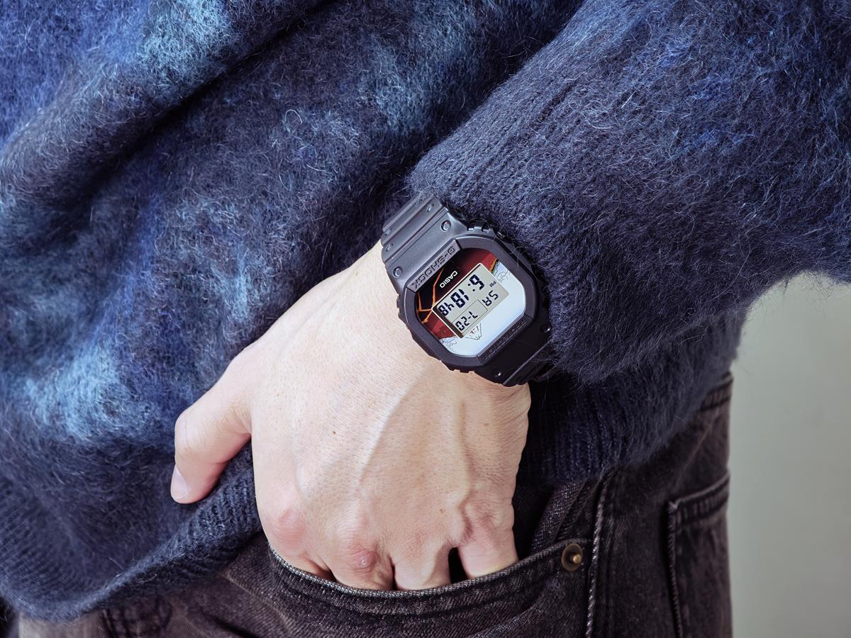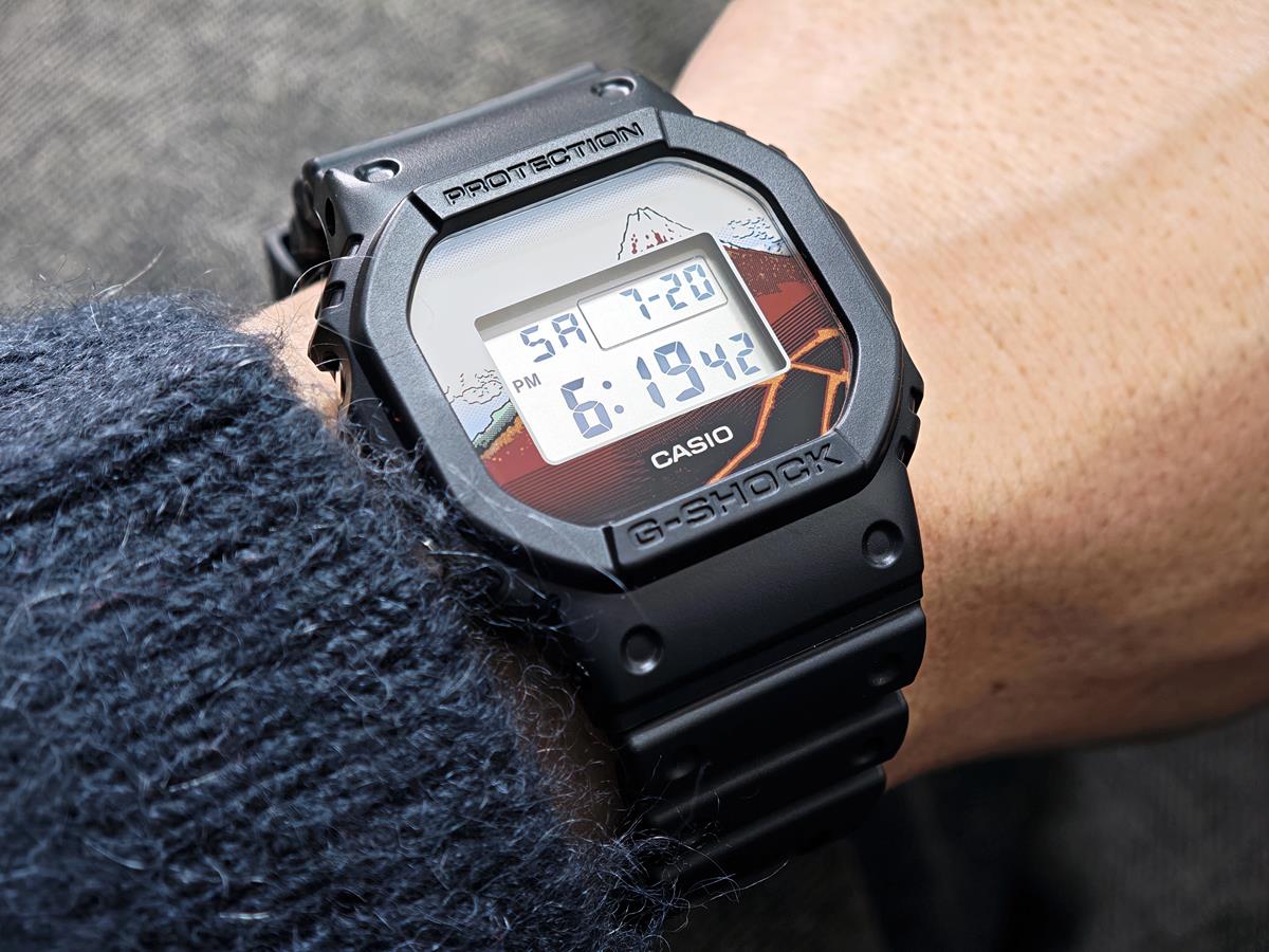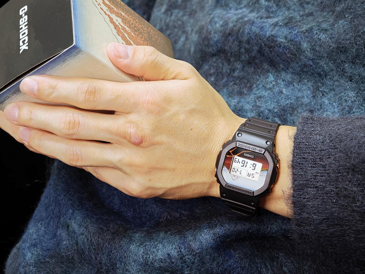 DW-5600KHSH25-1JRは、北斎の代表作である富嶽三十六景の中から「山下白雨」を採用しました。 ベースモデルにはアイコニックな定番デジタルDW-5600を採用し、文字板には「山下白雨」を大胆にデザイン。LEDバックライト点灯時には文字板と一体となって同作品の雄大さを表現します。 裏蓋には漢字で“日本”という文字を刻印しました。 また、日本で誕生した浮世絵にちなみ、made in Japanと生産地にもこだわりました。 グローバルにアピールすべく、パッケージにもこだわり特別仕様になっています。 |
