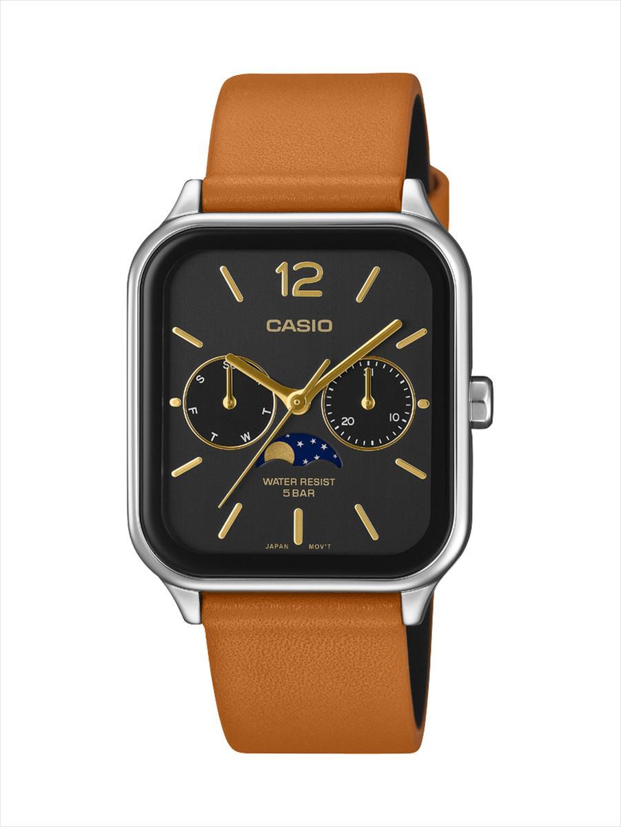 | ムーンフェイズ(月の形表示)と日付・曜日を搭載した角丸レクタンギュラーMTP-M305L-1AJF。 ブラック文字板にライトブラウンのレザーバンドを合わせた上品な配色。5気圧防水で普段使いに安心です。 |