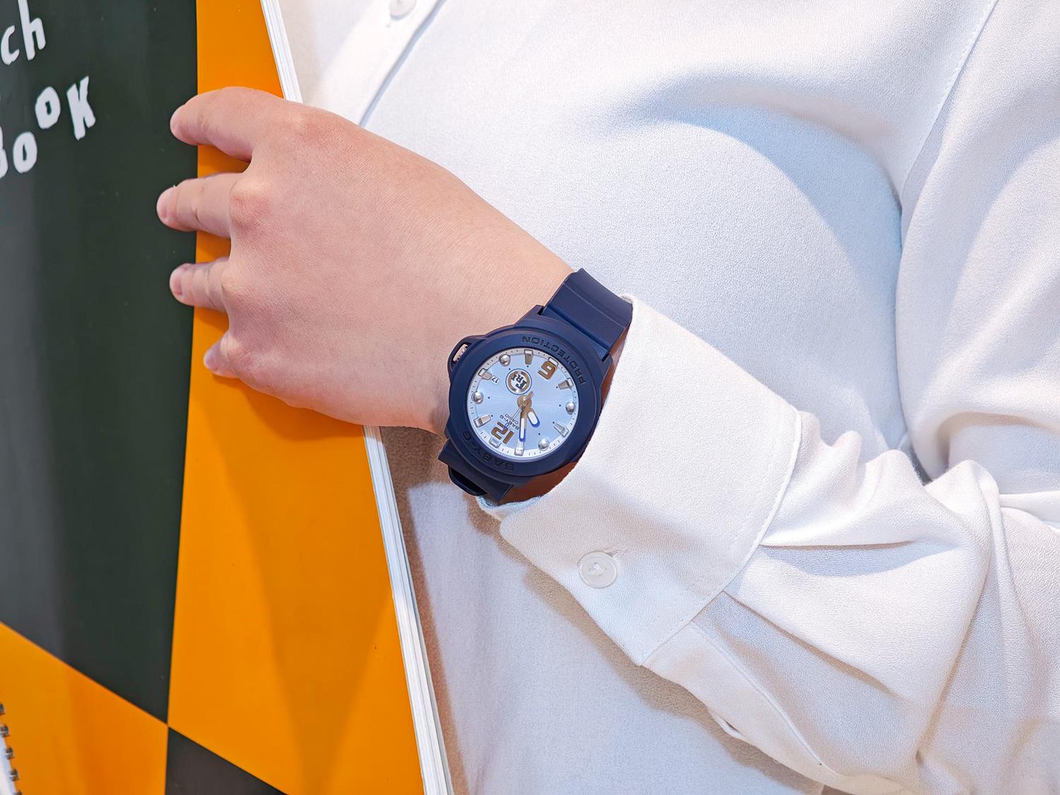 マットな質感に仕上げた時計本体とホルダーは柔らかなパステルカラーを揃え、落ちついた雰囲気はカジュアルからフェミニンまで幅広いスタイルに馴染みます。きらめき感のあるダイアルに、12時と6時位置にはアラビックインデックスを採用し、時刻の視認性にもこだわりました。曜日表示は日替わりでデザインが変わり、ポップなフォントとカラーでフェイスに毎日の楽しさを添えます。耐衝撃構造はもちろん、10気圧防水機能も備えており、実用性も兼備しています。 |