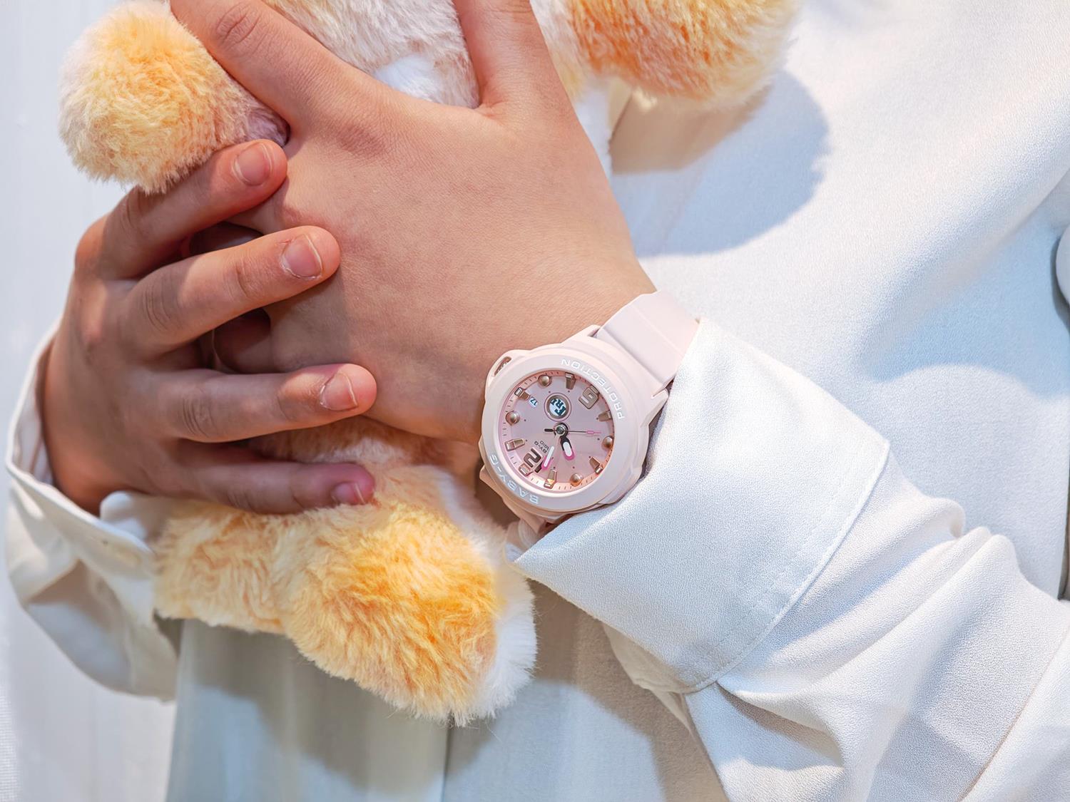 マットな質感に仕上げた時計本体とホルダーは柔らかなパステルカラーを揃え、落ちついた雰囲気はカジュアルからフェミニンまで幅広いスタイルに馴染みます。きらめき感のあるダイアルに、12時と6時位置にはアラビックインデックスを採用し、時刻の視認性にもこだわりました。曜日表示は日替わりでデザインが変わり、ポップなフォントとカラーでフェイスに毎日の楽しさを添えます。耐衝撃構造はもちろん、10気圧防水機能も備えており、実用性も兼備しています。 |