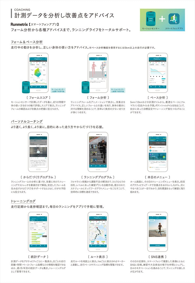 モーションセンサーと GSR-H1000ASが連携してランナーをサポート GPS・9軸センサー搭載のモーションセンサーでランニング中のからだの動きを高精度に計測。GSR-H1000ASと連携させ、計測データをリアルタイムに確認。 トップランナー層では、自身の走り方をデータ化し、専門知識をもつコーチの指導を受けるといった取り組みが積極的に行われていますが、一般ランナーにとって、そうした機会は多くありません。 その課題を解決するために、今回のパーソナルコーチングサービスを開発しました。 GPSや9軸センサーを搭載したモーションセンサー『CMT-S20R-AS』を腰に装着して走ることで、走行距離やペース、ピッチ、ストライドに加えて、体幹の傾きや骨盤の回転、接地衝撃などフォームに関する指標を多数算出。それらの指標をもとに、アプリ上にて3Dフォーム分析や改善のためのアドバイスを掲示し、目的に合わせた練習プランや、解析結果をもとに提示されるストレッチ、筋力トレーニングからなる“からだづくりプログラム”を作成します。 “G-SHOCK”『GSR-H1000AS』を活用すると、ランニング中にペースや距離、心拍などの情報も確認でき、さらにモーションセンサーと連携することで、フォーム指標をリアルタイムで確認することや、フォームの乱れを検知して通知することも可能です。 腰部に装着することでランニングフォームを高精度に計測する独自の技術を搭載。GPSを内蔵し単独利用も可能。約20時間※ 連続使用、防水企画 IPX7準拠。 ※温度25℃で連続使用時 アシックススポーツ工学研究所で培ったランニングの知見とカシオのセンシング技術を融合し、「パーソナルコーチング」を実現。ランナーの悩みをテクノロジーの力でサポート。 ■フォーム分析で「いまの自分」を知る 腰につけたMOTION SENSORで、全身のランニングフォームを評価。毎日の走りで、「いま」の自分の特徴だけでなく、いつもよりスピードを上げた時、距離を伸ばした時などの変化を分析。アドバイスに基づいた練習をすることで、効率よく、負担の少ない美しい走りに近づけます。 ■パーソナルコーチングで走れるからだづくり 日々のランニング傾向から導き出した「からだづくりプログラム」で、自分にあったトレーニングを提案。自分の目的別に必要なストレッチや筋トレなどのメニューで、フィジカル面を強化。効率的な、からだづくりで、走るためのからだを整えます。 ■自分に必要なランニングプログラム アシックスの知見に基づき、ランナーの目的やレベルに合わせ適した練習計画を自動作成する機能です。練習計画を完遂したのちに達成可能な予測タイムの算出や計画実行の進捗管理も可能。休息のタイミングも含め、中長期でプランのマネジメントを行うことにより、今日何を練習したらいい?などの悩みを解決します。 ■主な特徴 【モーションセンサー製品仕様】 ■通信機能: Bluetooth 5.0 (Low Energy) ■外部接続端子: マイクロUSB端子(USB充電) ■搭載センサー: 9軸センサー(加速度,ジャイロ,磁気),気圧 ■GPS搭載, GLONASS, みちびき 対応 ■記録容量: 約200km(使用状況により変化します) ■電源: リチウムイオン充電池(内蔵) ■電池寿命: 約20時間(温度25℃で連続使用時) ■本体サイズ:幅39.9mm×高さ62.1mm×奥行18.2mm、幅43.7mm×高さ63.6mm×奥行19.6mm(本体カバー含む) ■質量:約37g、約44g(本体カバー含む) ■付属品:USBケーブル、本体カバー、取扱説明書 |