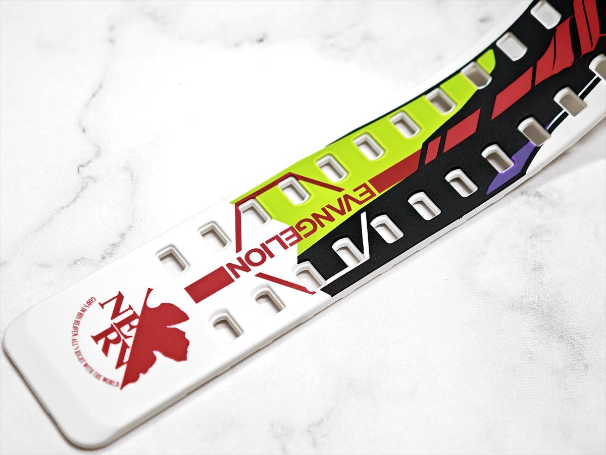 ベースモデルには、2010年の第1弾コラボレーションと同じく GA-110を採用。G-SHOCK全体にエヴァンゲリオンの意匠がちりばめられており、短バンドにはエヴァンゲリオン初号機の特徴的な角、ベゼル部分には初号機の顔、ベゼル下部から長バンドにかけてはロンギヌスの槍を握りしめ、今まさに投擲せんとする左腕がデザインされています。山下氏のデザインを忠実に再現するため、カシオが有する加工技術を駆使し完成させました。