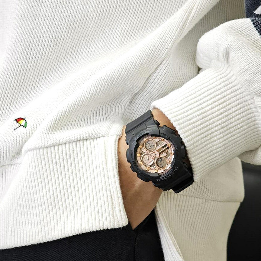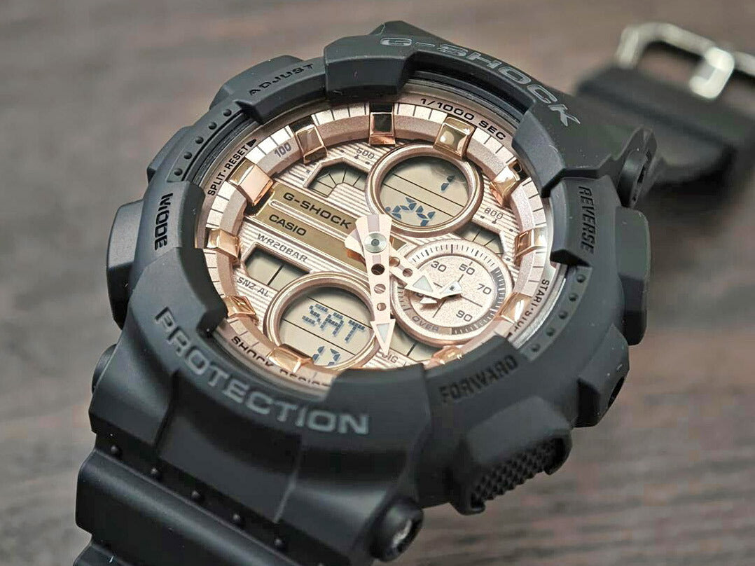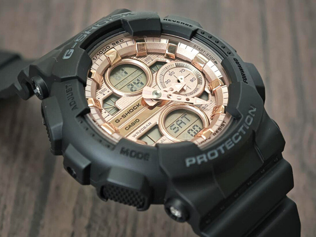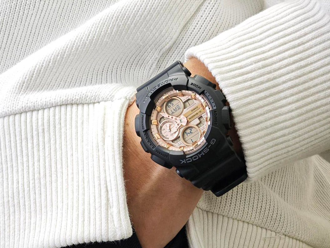 | 人気のアナログ・デジタルコンビネーションモデルGMA-S140シリーズをベースにした、ピンクゴールドのメタリックダイアルが印象的なモデルです。ブラックのボディに映えるピンクゴールドの輝きが、腕元にさりげない華やかさをプラスします。文字板と同系色のメタルアクセサリーとの重ね付けなど、自分らしいスタイルを楽しめるデザインに仕上げました。