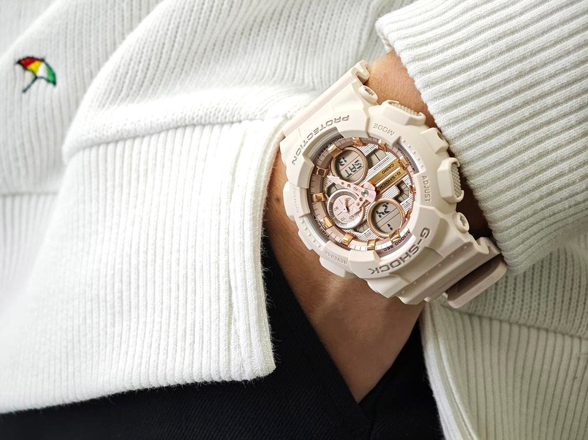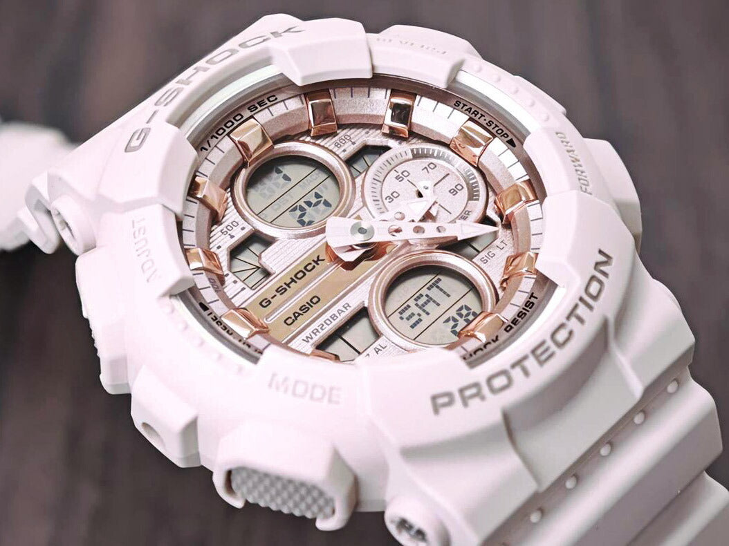| 人気のアナログ・デジタルコンビネーションモデルGMA-S140シリーズをベースにした、ピンクゴールドのメタリックダイアルが印象的なモデルです。ピンクのボディに映えるピンクゴールドの輝きが、腕元にさりげない華やかさをプラスします。文字板と同系色のメタルアクセサリーとの重ね付けで、自分らしいスタイルも楽しめる腕時計です。
