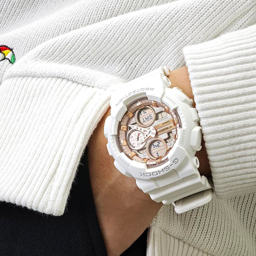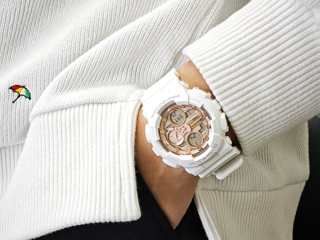 | 人気のアナログ・デジタルコンビネーションモデルGMA-S140シリーズをベースにした、ピンクゴールドのメタリックダイアルが印象的なモデルです。ホワイトのボディに映えるピンクゴールドの輝きが、腕元にさりげない華やかさをプラスします。文字板と同系色のメタルアクセサリーとの重ね付けで、自分らしいスタイルも楽しめる腕時計です。